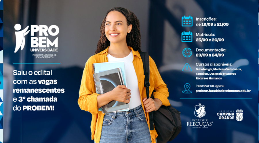 O Programa Municipal de Bolsa de Estudos Universitárias (PROBEM) abriu a 3ª chamada para preenchimento das vagas remanescentes em cursos de graduação. A iniciativa garante bolsa integral de 100%, oferecendo uma oportunidade única para jovens que desejam ingressar no ensino superior. As inscrições estão abertas entre os dias 18 e 21 de setembro, exclusivamente pelo site probem.faculdadedereboucas.edu.br.consulte Mais informação