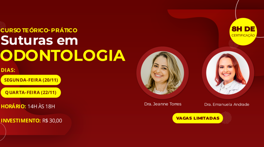 A Faculdade Rebouças de Campina Grande (FRCG) tem o prazer de anunciar a abertura das inscrições para o curso de Suturas em Odontologia a partir desta quinta-feira, dia 9. O curso, programado para os dias 20 e 22 de novembro, consistirá em um módulo único com o objetivo de apresentar e aprimorar as técnicas de sutura em procedimentos cirúrgicos odontológicos para os acadêmicos de odontologia. Conteúdo Programático: Planejamento de incisões...consulte Mais informação