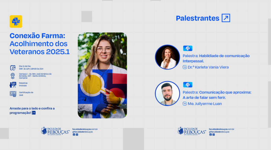 A Faculdade Rebouças realiza, neste semestre, o Conexão Farma: Acolhimento dos Veteranos 2025.1, um evento voltado para os estudantes do curso de Farmácia que marca o reencontro acadêmico e fortalece os laços entre discentes, docentes e a instituição. A programação contará com palestras que abordam temas fundamentais para o desenvolvimento pessoal e profissional dos futuros farmacêuticos.consulte Mais informação