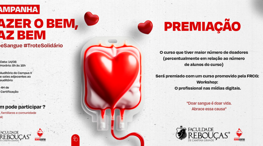 A Faculdade Rebouças convida todos para participar do “Trote Solidário”, uma ação em parceria com o Hemocentro, que acontecerá no dia 14 de agosto, no Campus II. Este evento oferece uma oportunidade única de contribuir para a sociedade por meio da doação de sangue, um gesto simples que pode salvar até quatro vidas. O evento é aberto para alunos, familiares e toda a comunidade. O curso que conseguir mobilizar o...consulte Mais informação