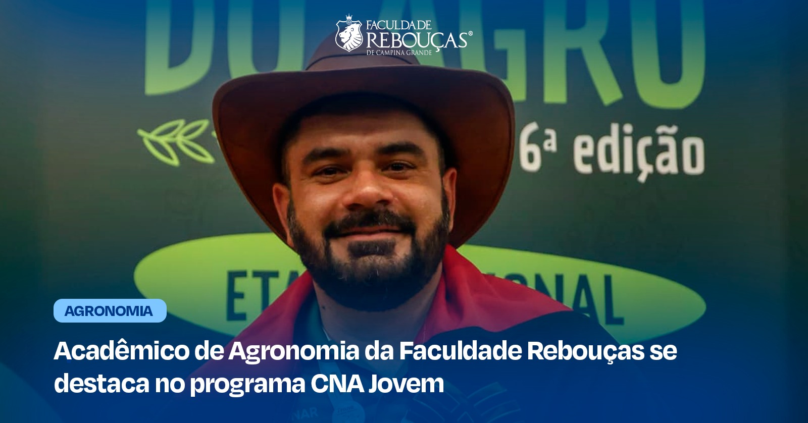 A Faculdade Rebouças parabeniza o acadêmico Philipe Andrade, do curso de Agronomia, pela participação e destaque no CNA Jovem, uma das principais iniciativas de formação de novas lideranças do agronegócio brasileiro, promovida pelo Sistema CNA/Senar.