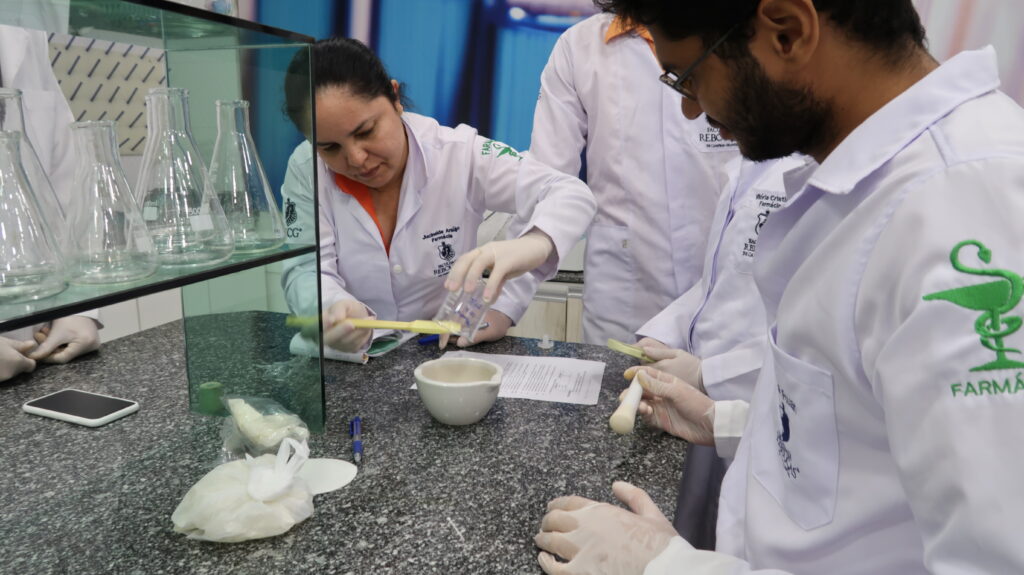 A atividade foi supervisionada pela professora Daniele Rocha, que conduziu os alunos por todas as etapas da manipulação, destacando os cuidados técnicos e sanitários exigidos nesse tipo de formulação.